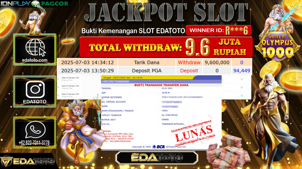 Selamat Kepada Pemilik user ID : R***6 Hari/Tanggal : Jum’at/ 04, Juli 2025 Jackpot : Rp. 9.600.000 JT Permainan : . . .