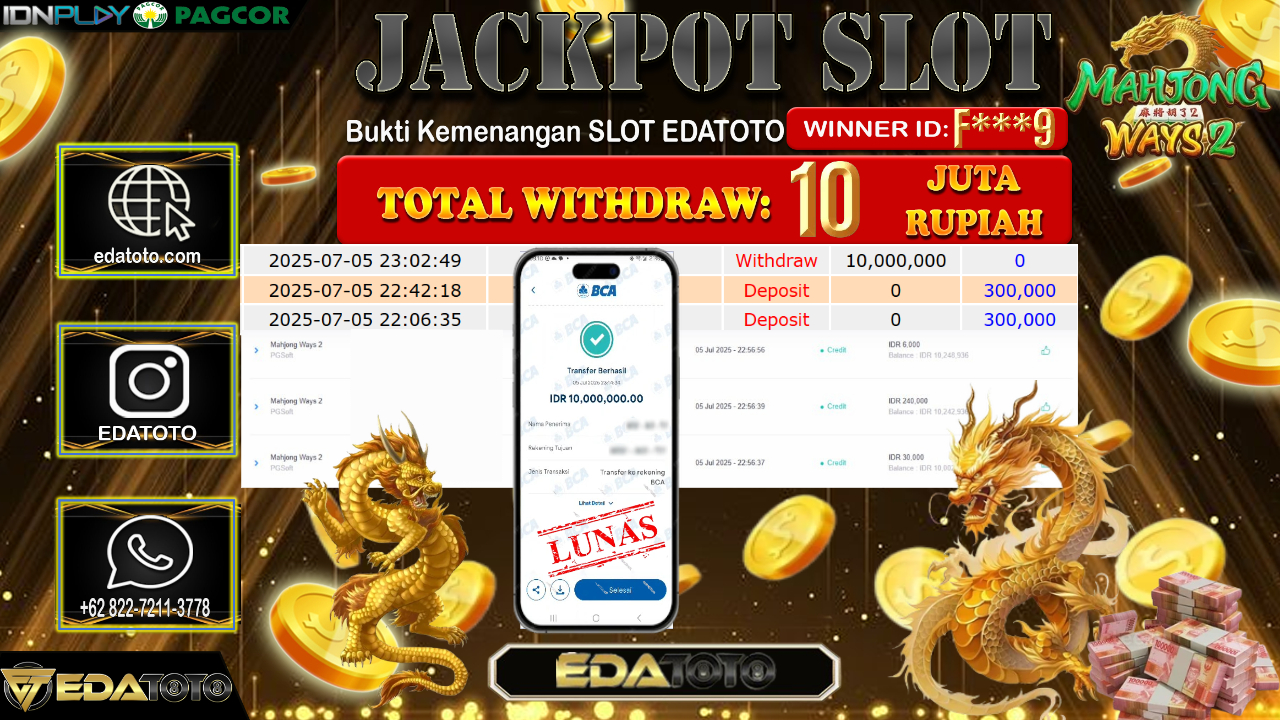 Selamat Kepada Pemilik user ID : F***9 Hari/Tanggal : Minggu/ 06, Juli 2025 Jackpot : Rp. 10.000.000 JT Permainan : . . .