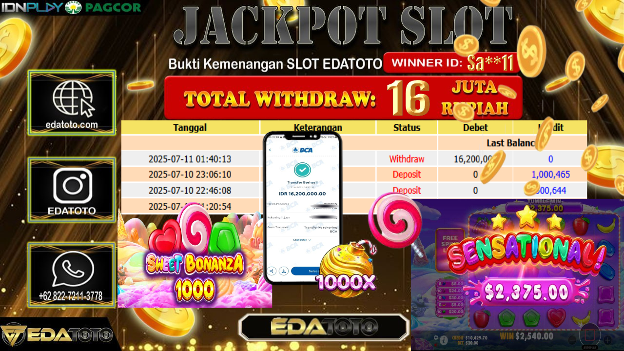 Selamat Kepada Pemilik user ID : Sa**11 Hari/Tanggal : Jumat/ 11, Juli 2025 Jackpot : Rp. 16.200.000 JT Permainan . . .