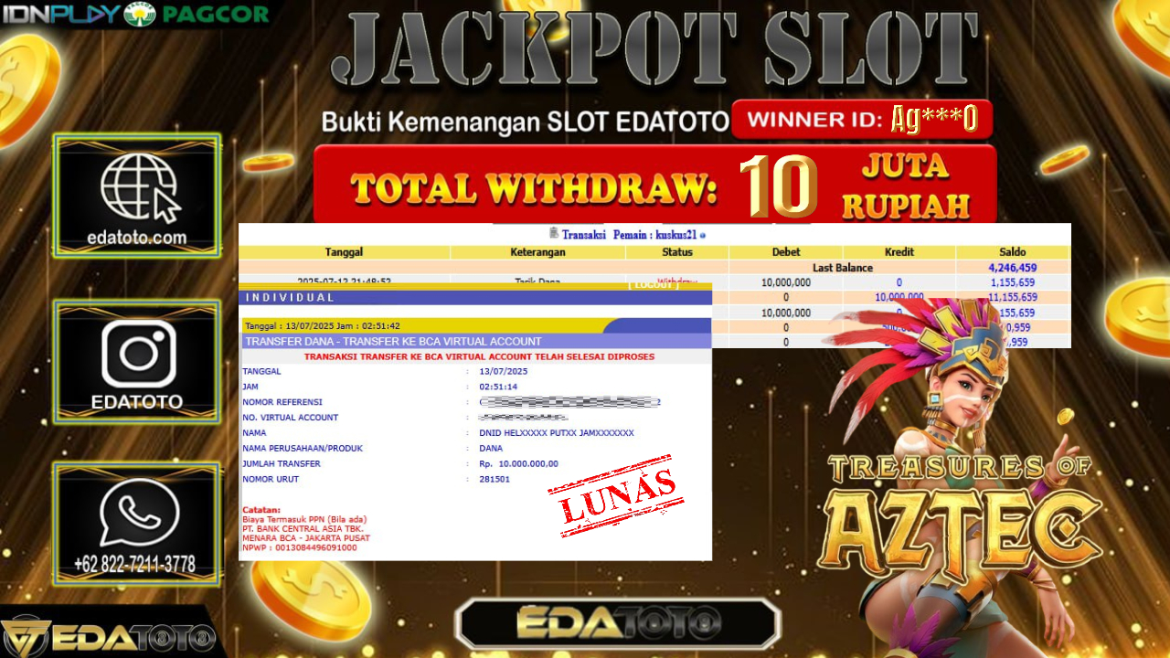 Selamat Kepada Pemilik user ID : Ag***0 Hari/Tanggal : Minggu/ 13, Juli 2025 Jackpot : Rp. 10.000.000 JT Permainan . . .