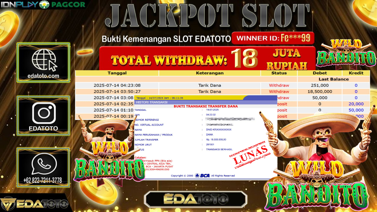 Selamat Kepada Pemilik user ID : Fe***99 Hari/Tanggal : Senin/ 14, Juli 2025 Jackpot : Rp. 18.500.000 JT Permainan . . .