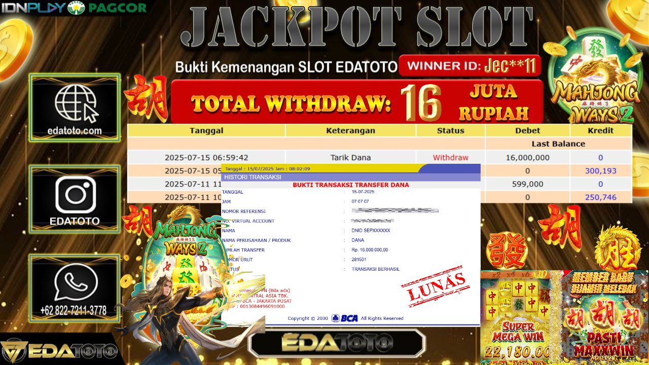 Selamat Kepada Pemilik user ID : Jec**11 Hari/Tanggal : Selasa/ 15, Juli 2025 Jackpot : Rp. 16.000.000 JT . . .
