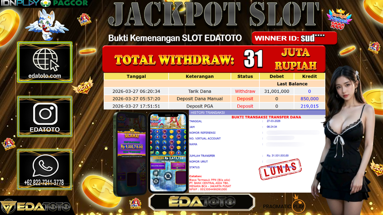 Selamat Kepada Pemilik user ID : Sud Hari/Tanggal : Jumat / 27 MARET 2026 Jackpot : Rp,  29,256,820 JT Withdraw . . .