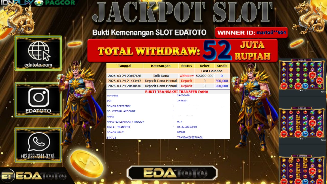 Selamat Kepada Pemilik user ID : martoli**654 Hari/Tanggal : Selasa / 24 MARET 2026 Jackpot : Rp,  40,000,000 JT Withdraw . . .