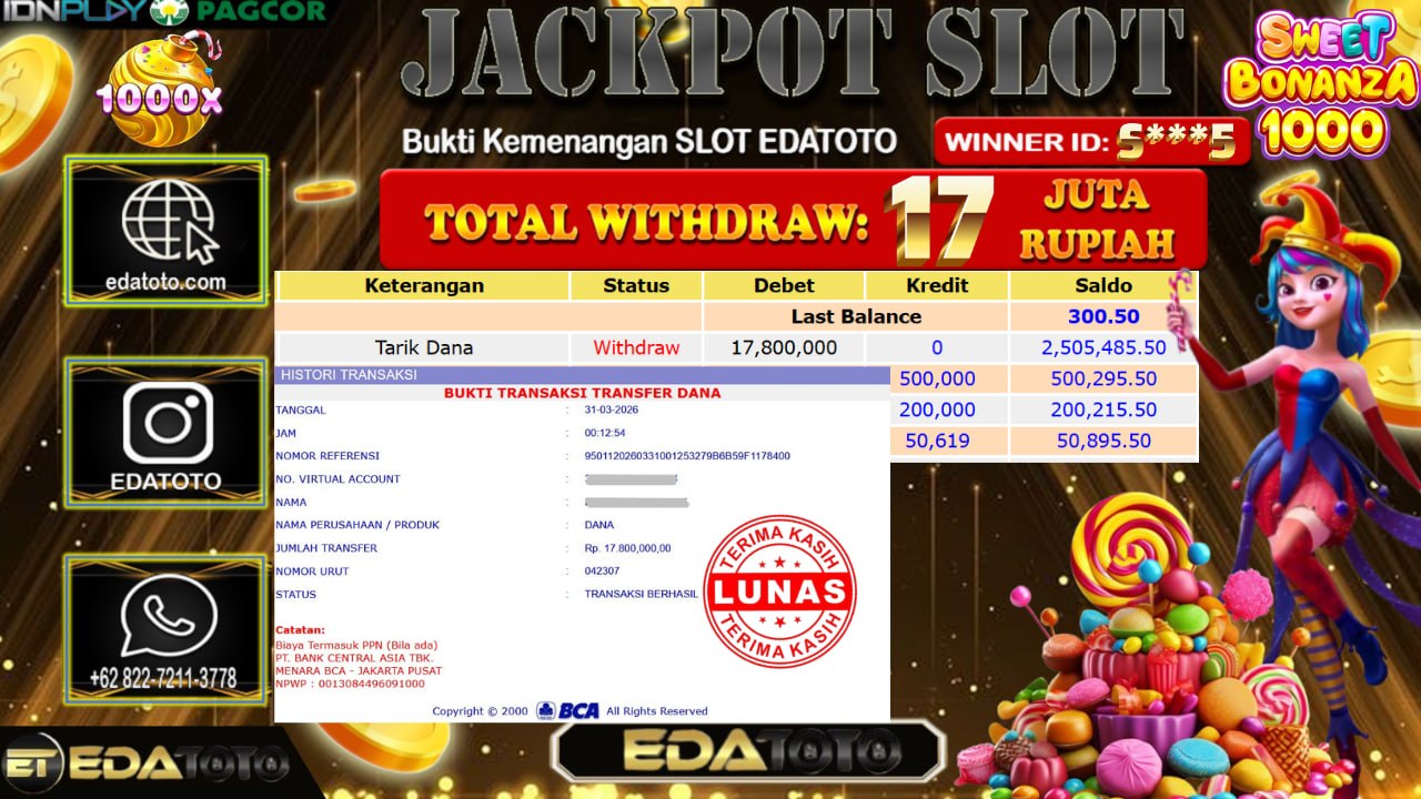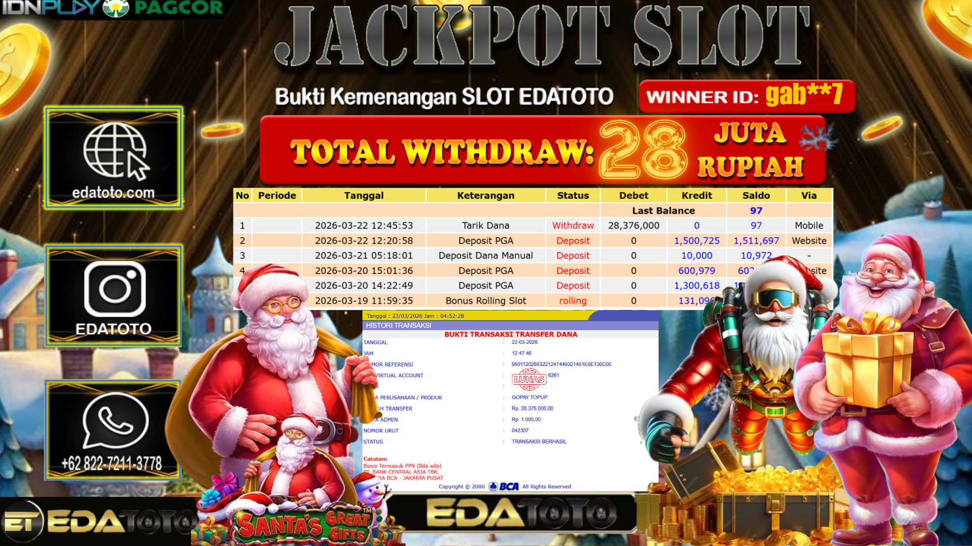 Selamat Kepada Pemilik user ID : S***5 Hari/Tanggal : Senin / 30 MARET 2026 Jackpot : Rp,  15,254,281 JT Withdraw . . .