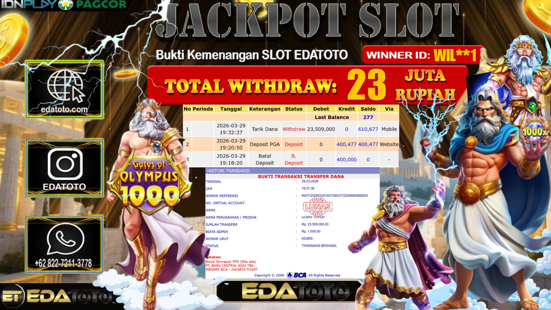 Selamat Kepada Pemilik user ID : WIL**1 Hari/Tanggal : Minggu / 29 MARET 2026 Jackpot : Rp,  20,125,115 JT Withdraw . . .