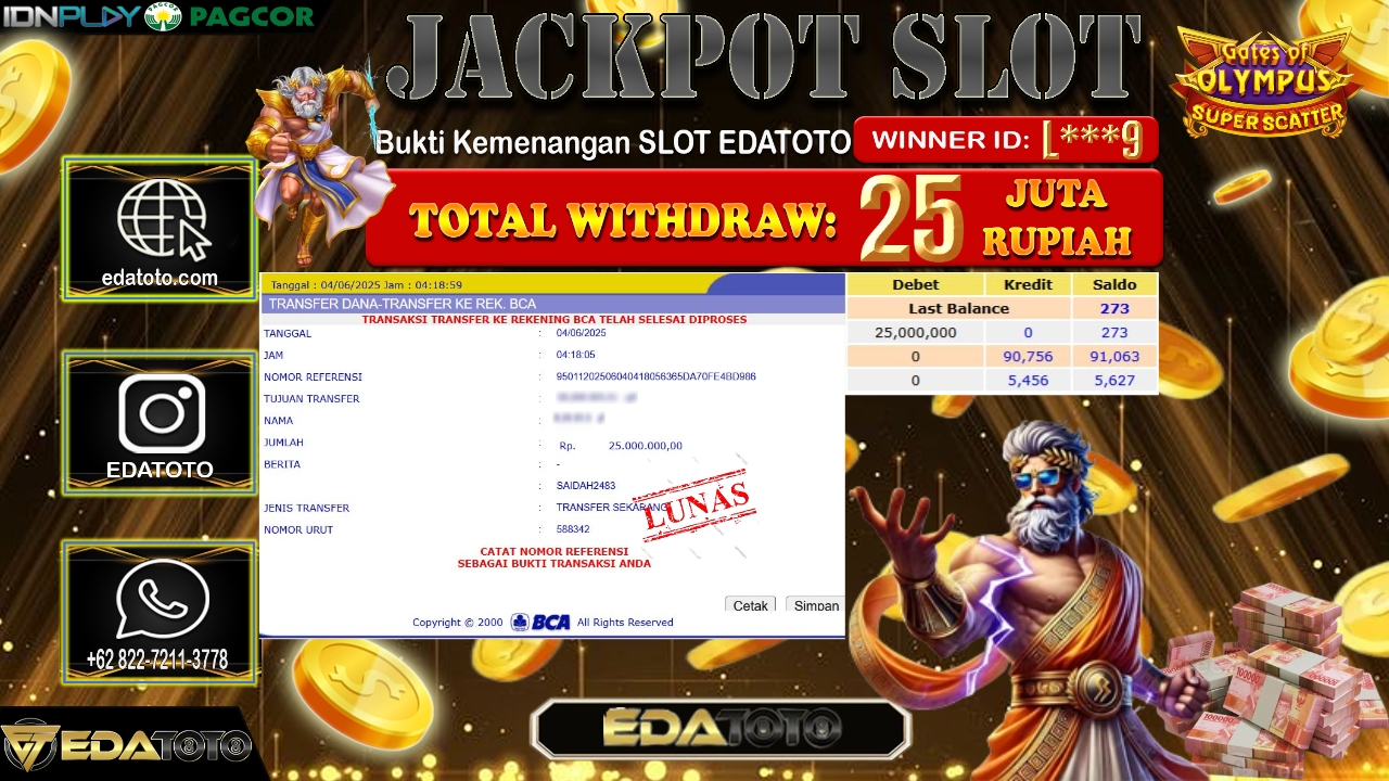 Selamat Kepada Pemilik user ID : L***9 Hari/Tanggal : Rabu/ 04, Juni 2025 Jackpot : Rp. 25.000.000 JT Permainan : Gates . . .