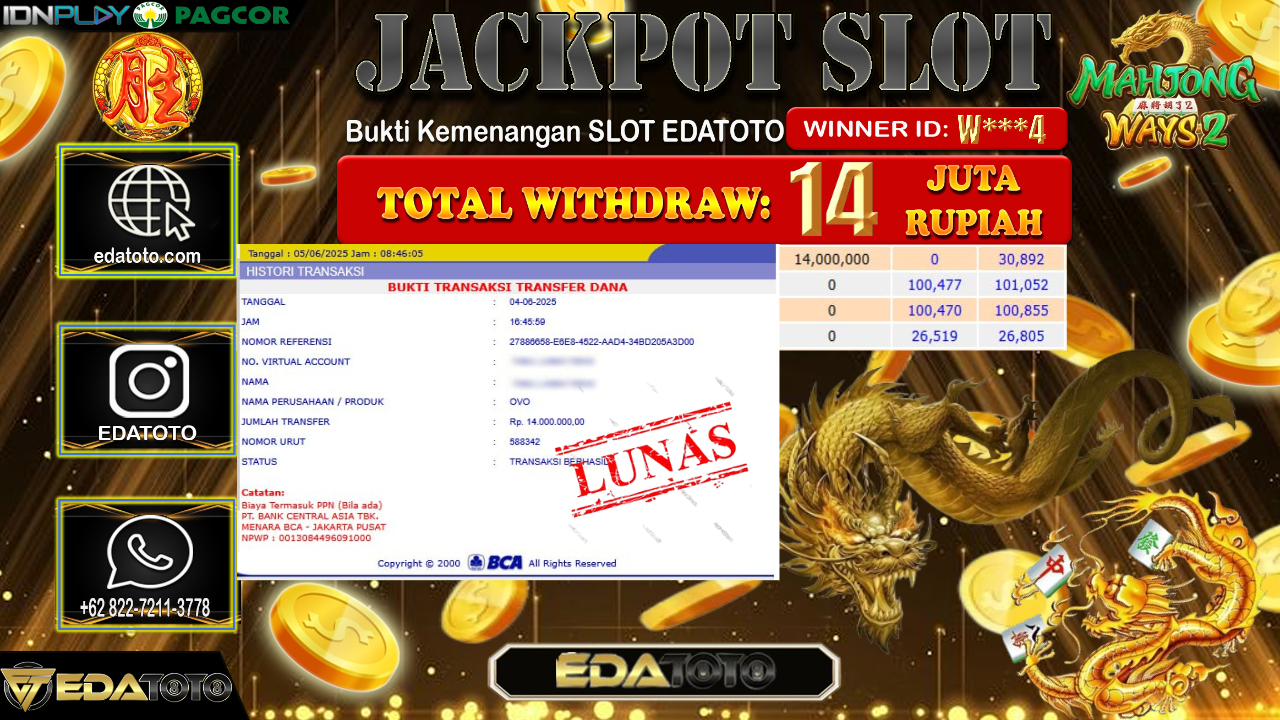 Selamat Kepada Pemilik user ID : W***4 Hari/Tanggal : Kamis/ 05, Juni 2025 Jackpot : Rp. 14.000.000 JT Permainan : Mahjong Ways2 . . .