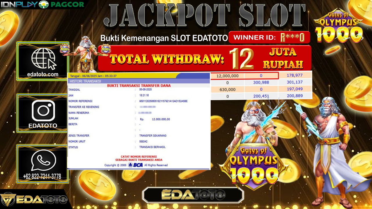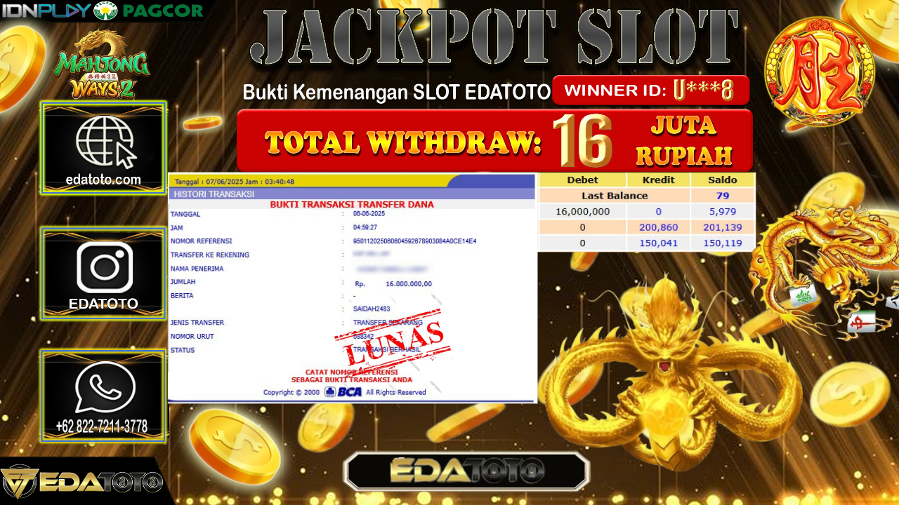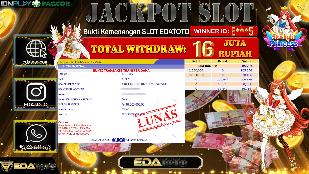Selamat Kepada Pemilik user ID : E***5 Hari/Tanggal : Kamis/ 12, Juni 2025 Jackpot : Rp. 16.000.000 JT Permainan : . . .