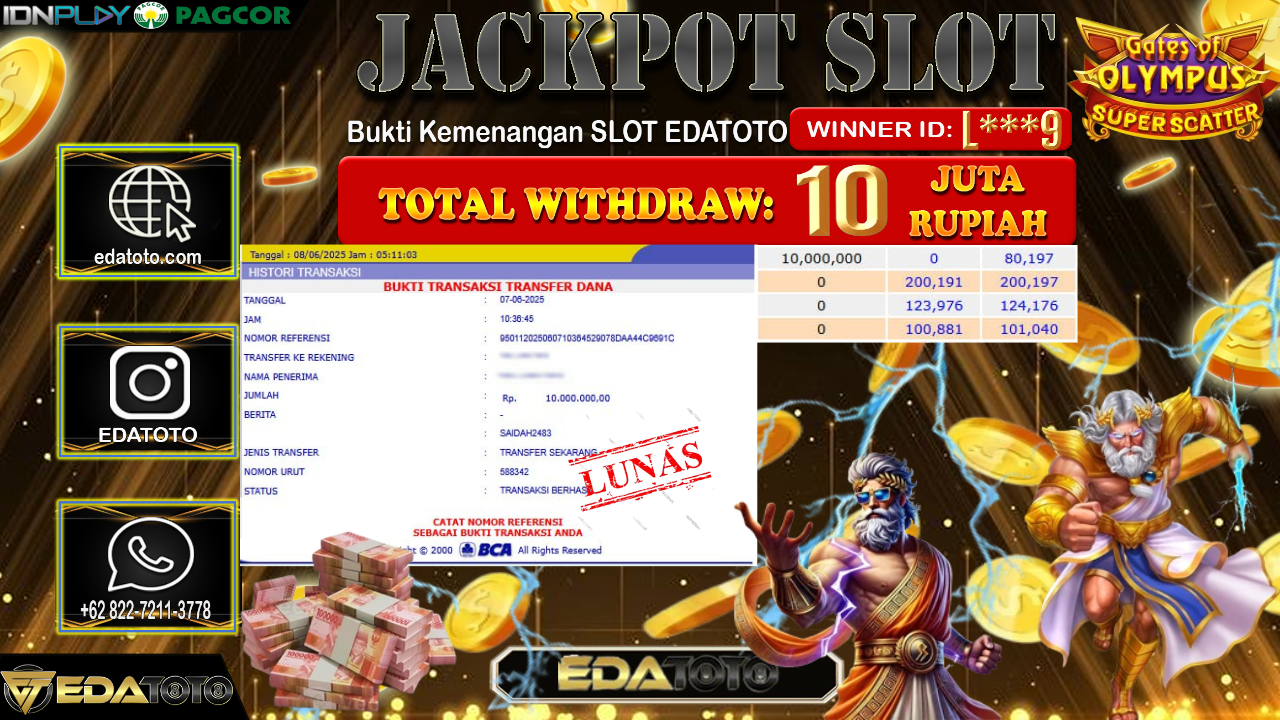 Selamat Kepada Pemilik user ID : L***9 Hari/Tanggal : Minggu/ 08, Juni 2025 Jackpot : Rp. 10.000.000 JT . . .