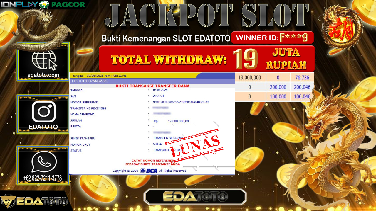 Selamat Kepada Pemilik user ID : F***9 Hari/Tanggal : Senin/ 09, Juni 2025 Jackpot : Rp. 19.000.000 JT Permainan : Mahjong . . .