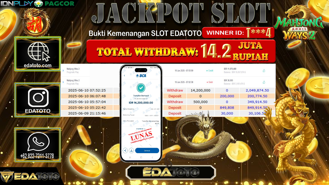 Selamat Kepada Pemilik user ID : T***4 Hari/Tanggal : Selasa/ 10, Juni 2025 Jackpot : Rp. 14.200.000 JT Permainan : Mahjong . . .