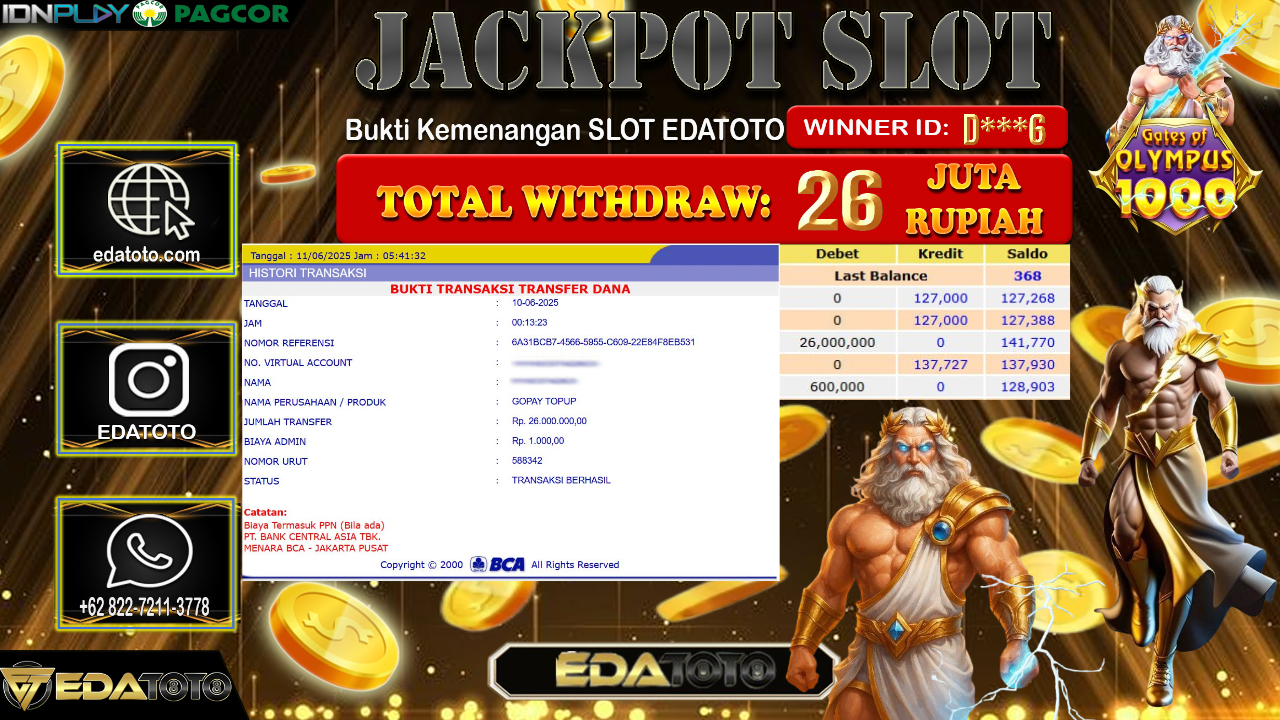 Selamat Kepada Pemilik user ID : D***6 Hari/Tanggal : Rabu/ 11, Juni 2025 Jackpot : Rp. 26.000.000 JT Permainan : . . .
