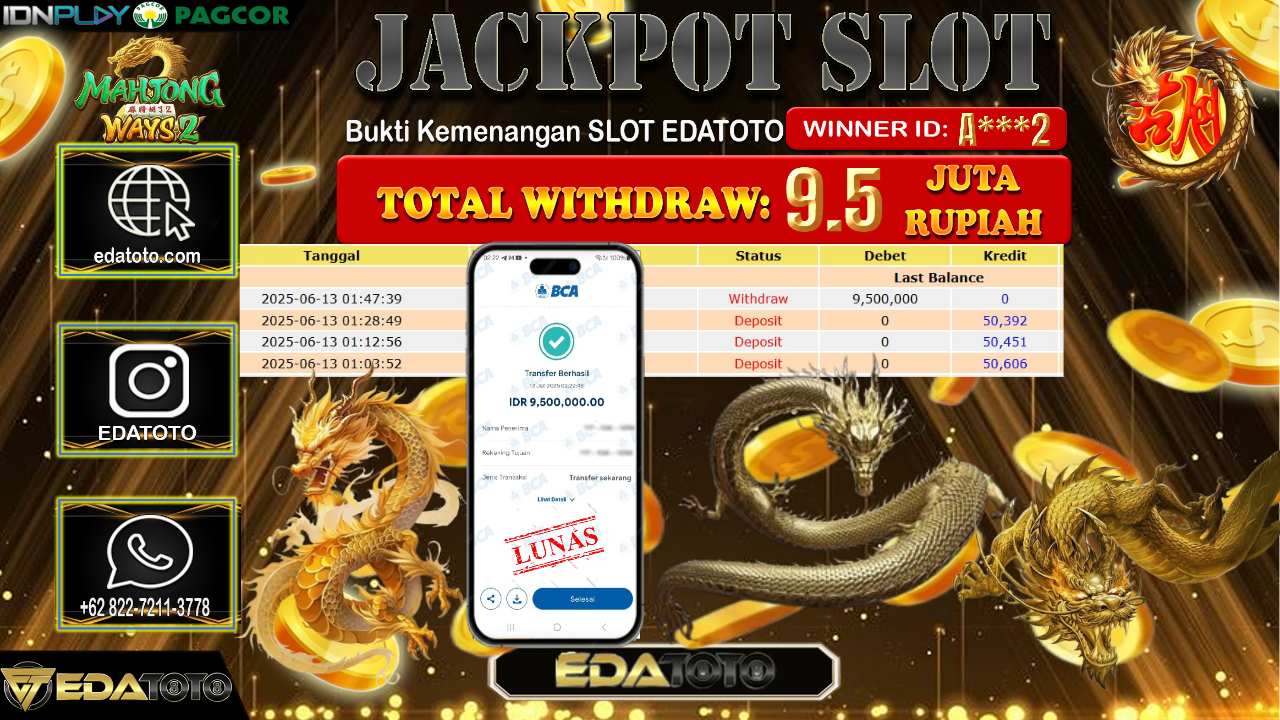 Selamat Kepada Pemilik user ID : A***2 Hari/Tanggal : Jum’at/ 13, Juni 2025 Jackpot : Rp. 9.500.000 JT Permainan : . . .