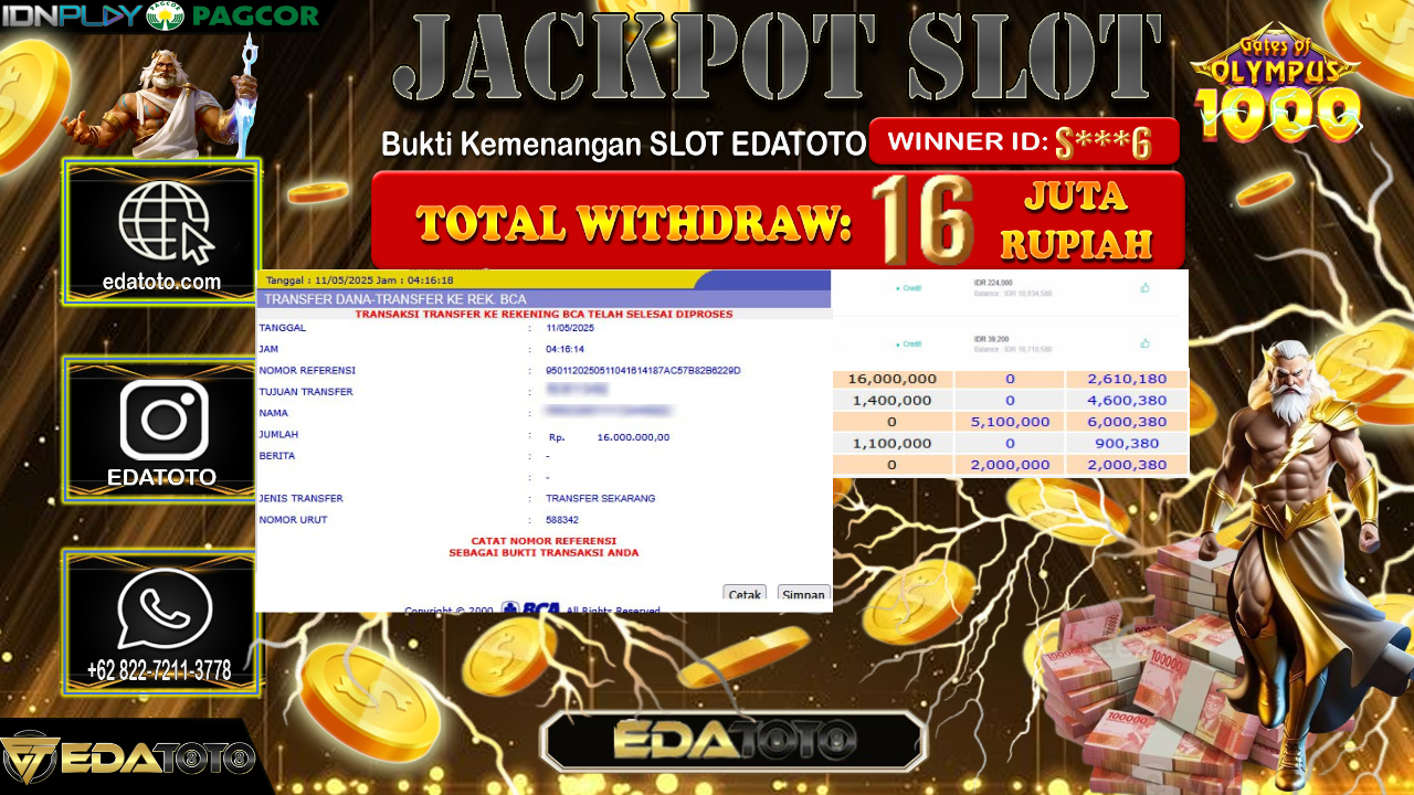 Selamat Kepada Pemilik user ID : S***6 Hari/Tanggal : Senin/ 12, Mei 2025 Jackpot : Rp. 16.000.000 JT Permainan : Gates . . .