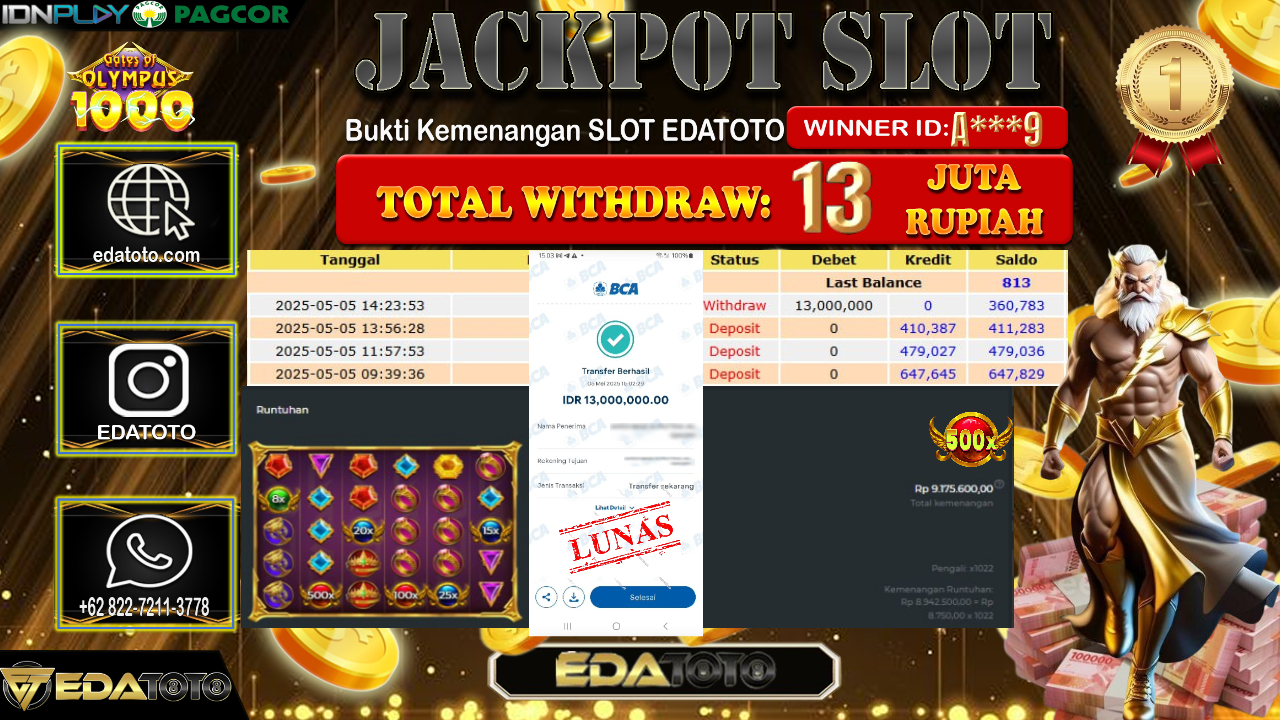 Selamat Kepada Pemilik user ID : A***9 Hari/Tanggal : Selasa/ 06, Mei 2025 Jackpot : Rp. 13.000.000 JT Permainan . . .