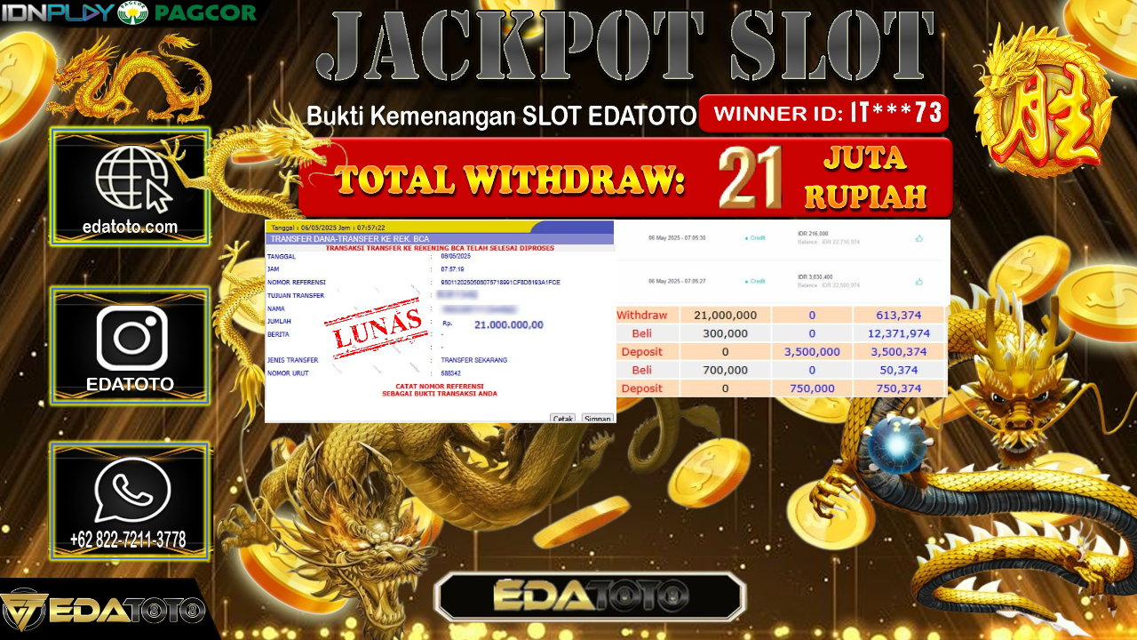 Selamat Kepada Pemilik user ID : IT***73 Hari/Tanggal : Rabu/ 07, Mei 2025 Jackpot : Rp. 21.000.000 JT Permainan . . .