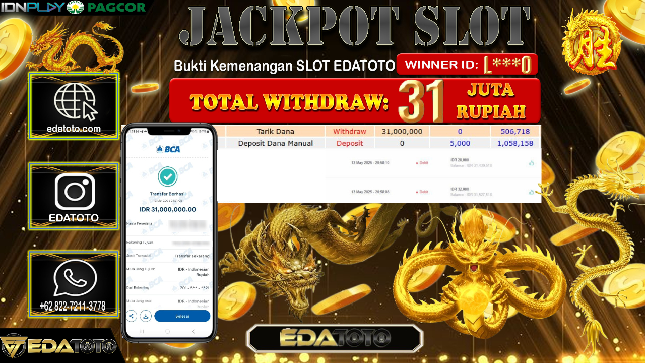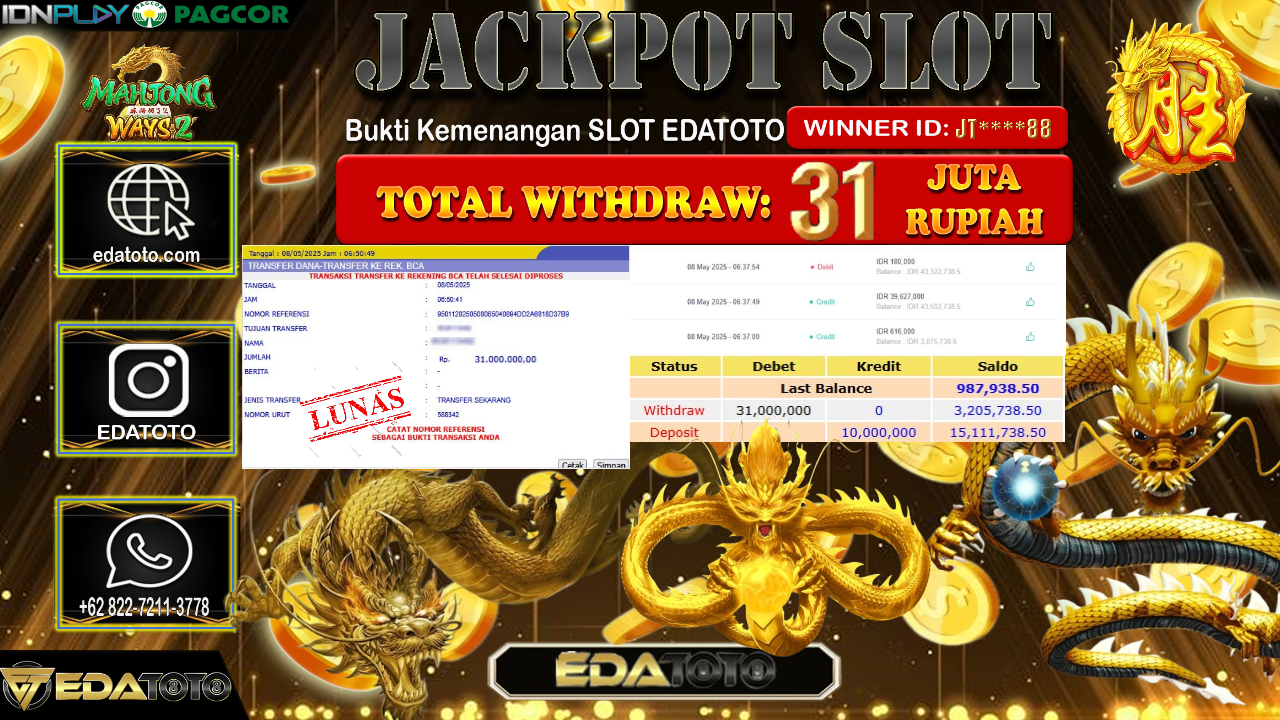 Selamat Kepada Pemilik user ID : JT****88 Hari/Tanggal : Jum’at/ 09, Mei 2025 Jackpot : Rp. 31.000.000 JT Permainan . . .