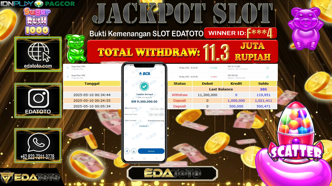 Selamat Kepada Pemilik user ID : F***4 Hari/Tanggal : Sabtu/ 10, Mei 2025 Jackpot : Rp. 11.300.000 JT Permainan : Sugar . . .