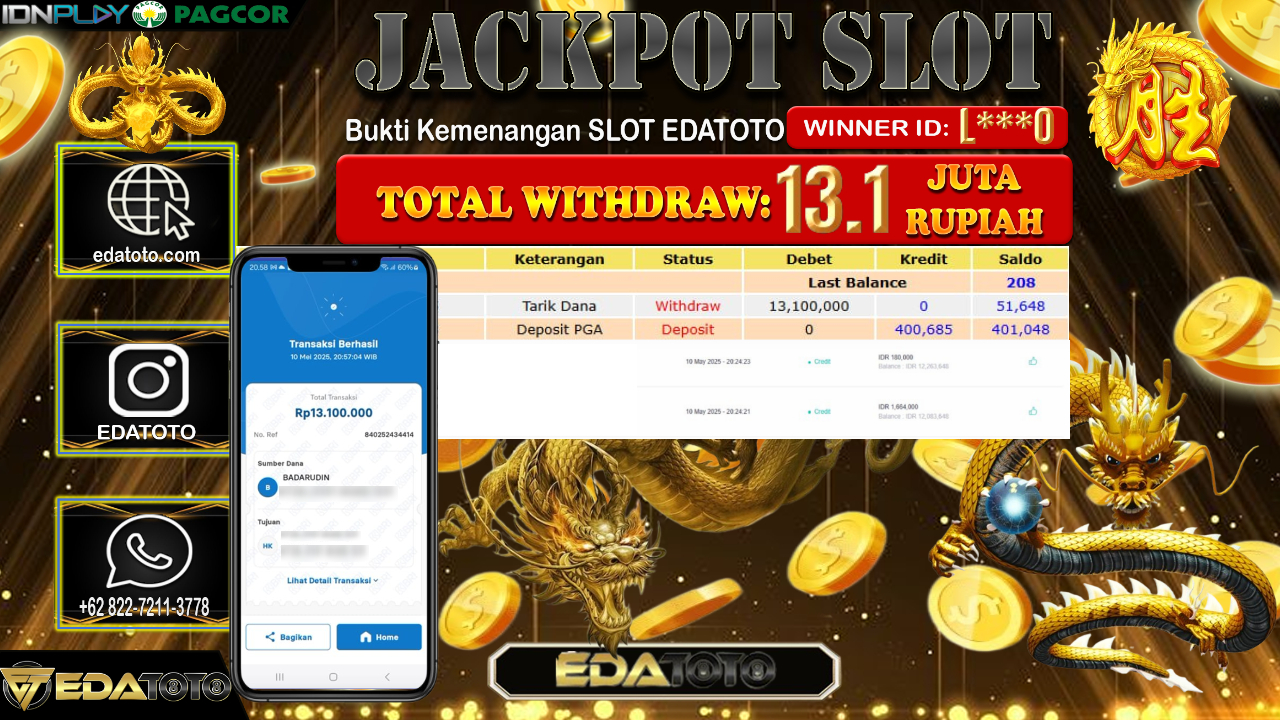 Selamat Kepada Pemilik user ID : L***0 Hari/Tanggal : Minggu/ 11, Mei 2025 Jackpot : Rp. 13.100.000 JT Permainan . . .