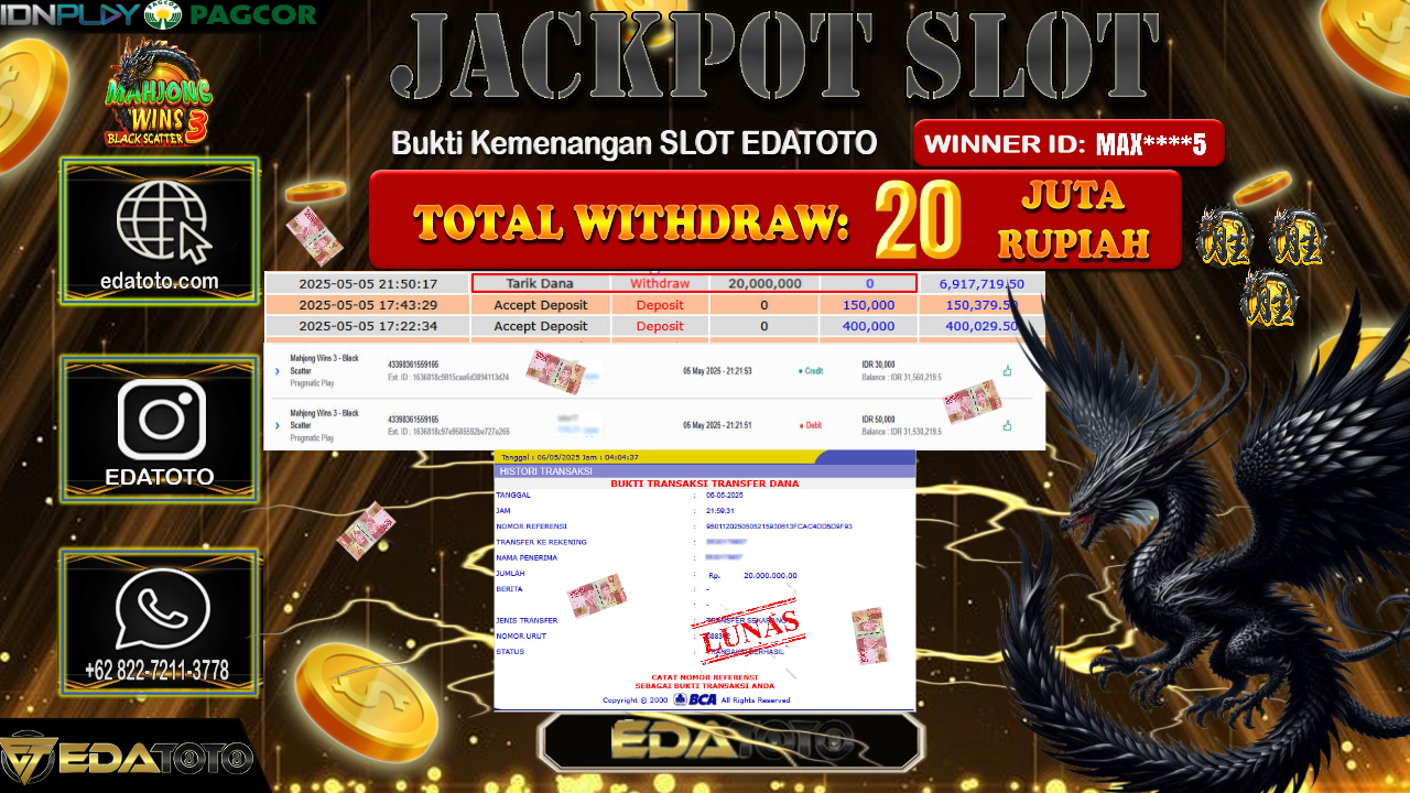 Selamat Kepada Pemilik user ID : MAX****5 Hari/Tanggal : Selasa/ 06, Mei 2025 Jackpot : Rp. 20.000.000 JT Permainan : MAHJONG . . .