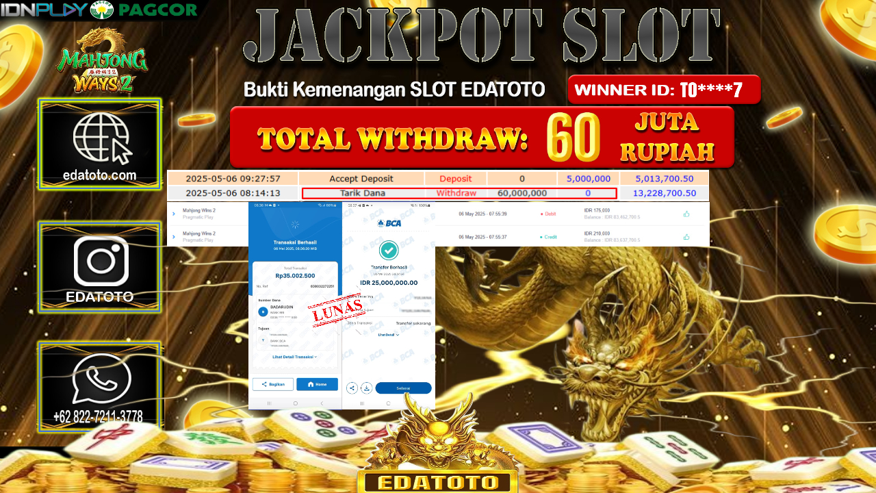 Selamat Kepada Pemilik user ID : TO****7 Hari/Tanggal : Rabu/ 07, Mei 2025 Jackpot : Rp. 60.000.000 JT Permainan : MAHJONG . . .