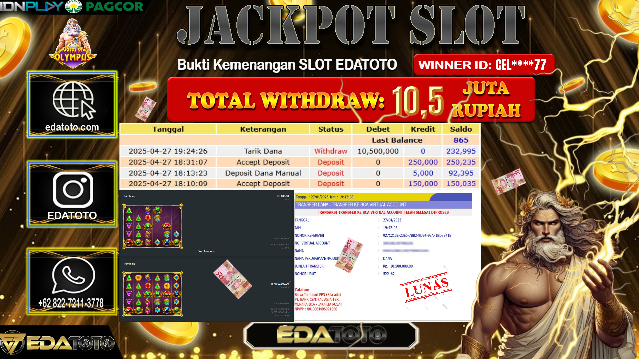 Selamat Kepada Pemilik user ID : CEL****77 Hari/Tanggal : Senin / 28, April 2025 Jackpot : Rp. 10.500.000 JT Permainan : GATES . . .