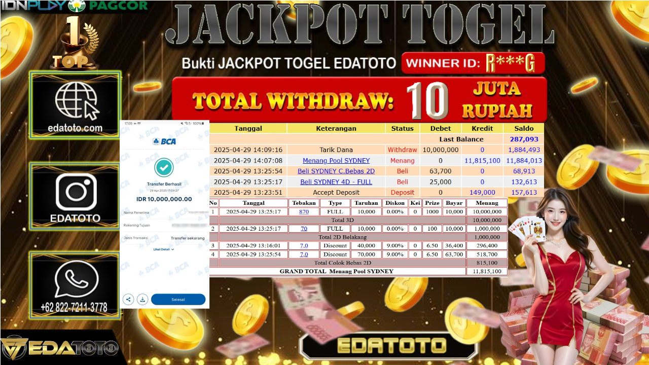 Selamat Kepada Pemilik user ID : R***G Hari/Tanggal : RABU/ 30 April 2025 Jackpot : Rp. 10.000.000 JT Permainan : TOGEL Selamat . . .