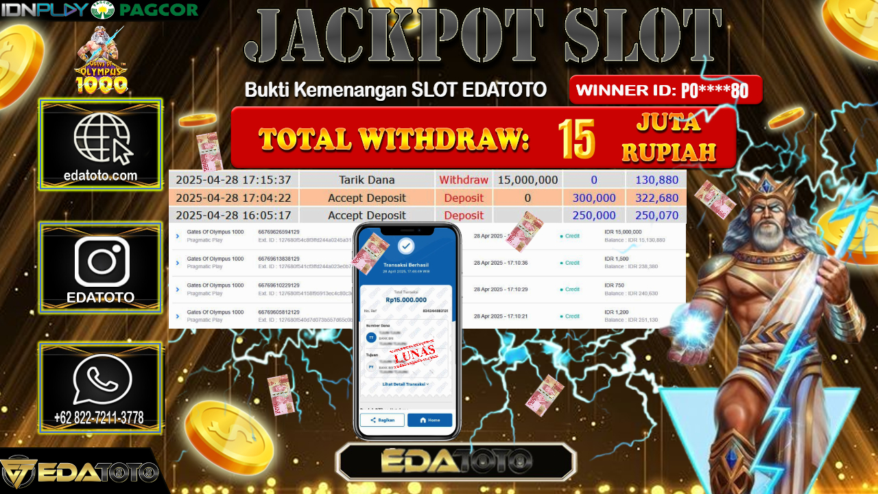 Selamat Kepada Pemilik user ID : PO****80 Hari/Tanggal : Selasa/ 29, April 2025 Jackpot : Rp. 15.000.000 JT Permainan : GATES OF . . .