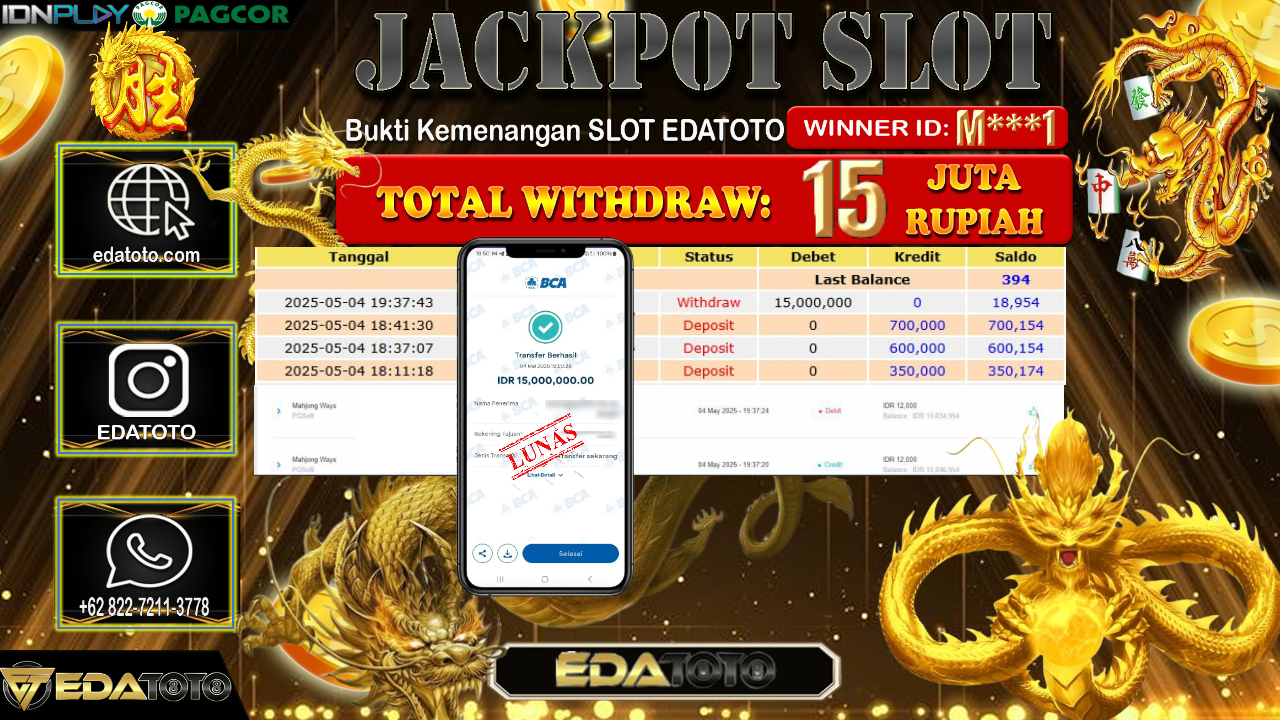 Selamat Kepada Pemilik user ID : M***1 Hari/Tanggal : Senin/ 05, Mei 2025 Jackpot : Rp. 15.000.000 JT Permainan : Mahjong . . .