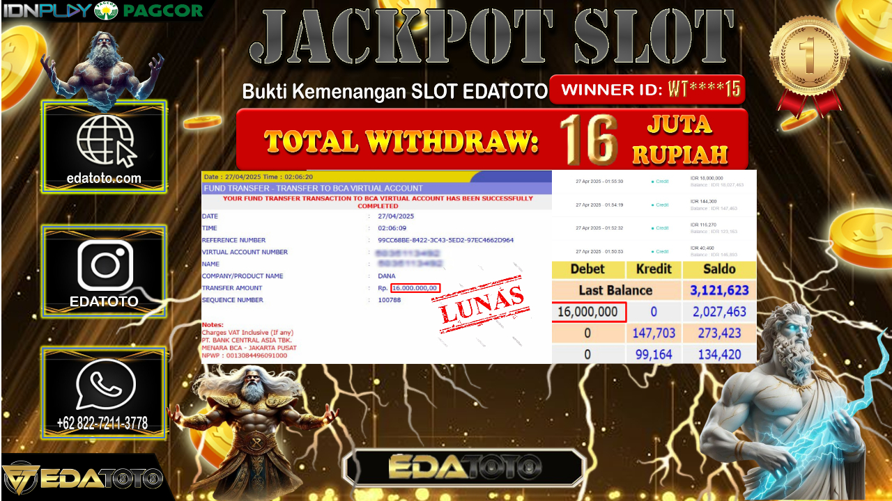 Selamat Kepada Pemilik user ID : WT****88 Hari/Tanggal : Minggu / 27 , April 2025 Jackpot : Rp. 16.000.000 JT Permainan . . .