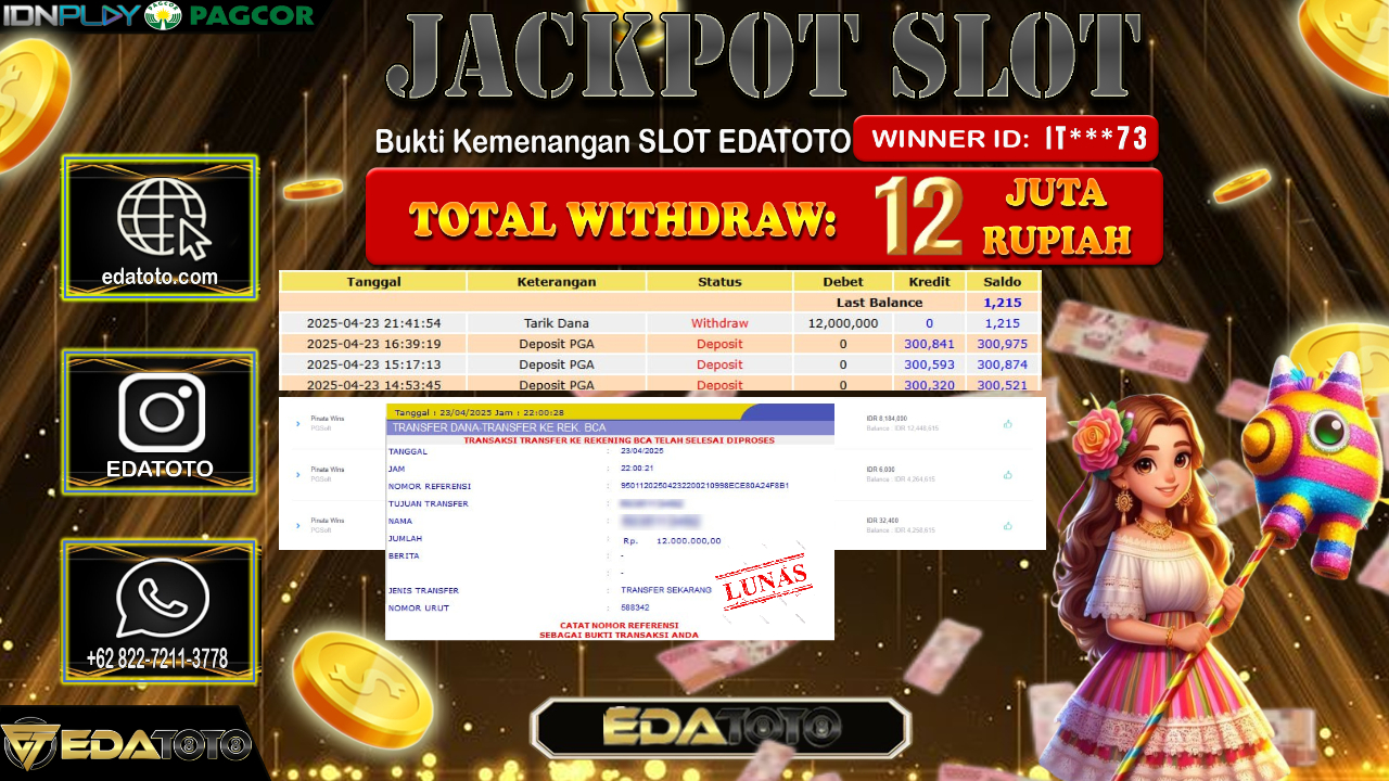 Selamat Kepada Pemilik user ID : IT***73 Hari/Tanggal : Kamis / 24 , April 2025 Jackpot : Rp. 12.000.000 JT Permainan . . .