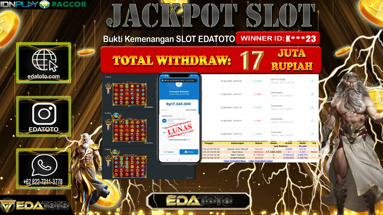 Selamat Kepada Pemilik user ID : K***23 Hari/Tanggal : Jumat/ 25 , April 2025 Jackpot : Rp. 17.000.000 JT Permainan . . .