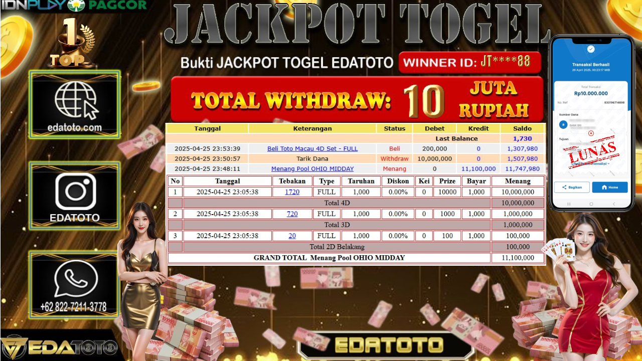 Selamat Kepada Pemilik user ID : EG****T Hari/Tanggal : Rabu/ 23 , April 2025 Jackpot : Rp. 10.000.000 JT Permainan : . . .