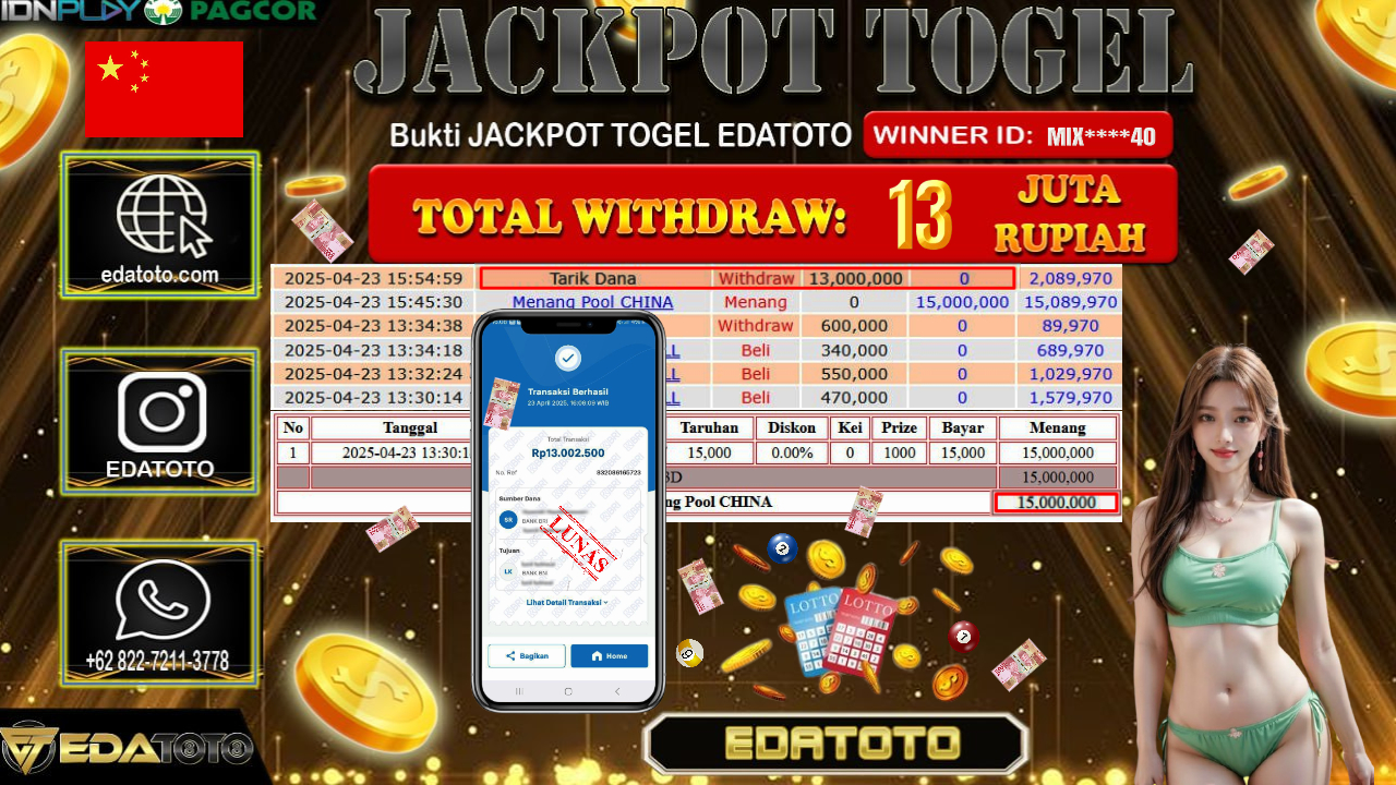Selamat Kepada Pemilik user ID : MIX****40 Hari/Tanggal : Jumat/ 25 , April 2025 Jackpot : Rp. 13.000.000 JT Permainan : . . .