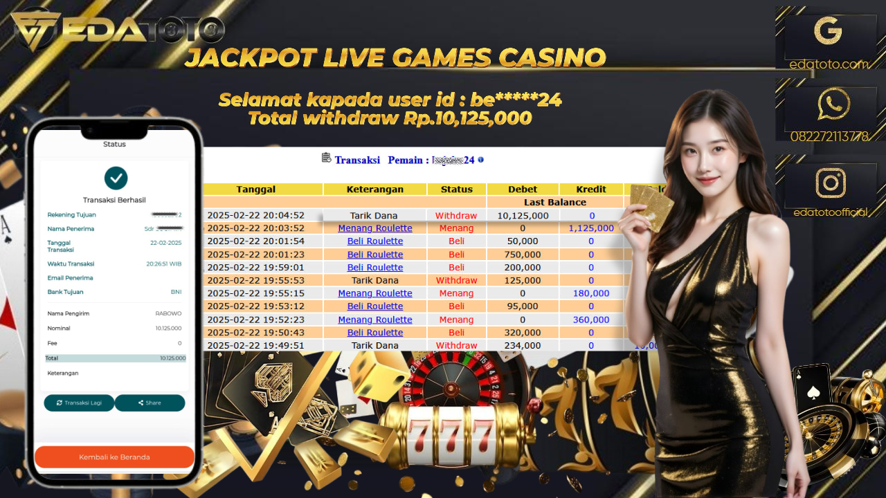 Selamat Kepada Pemilik user ID : be*****24 Hari/Tanggal : Senin / 22 , FEBRUARY 2025 Jackpot : Rp. 10.125.000 JT . . .