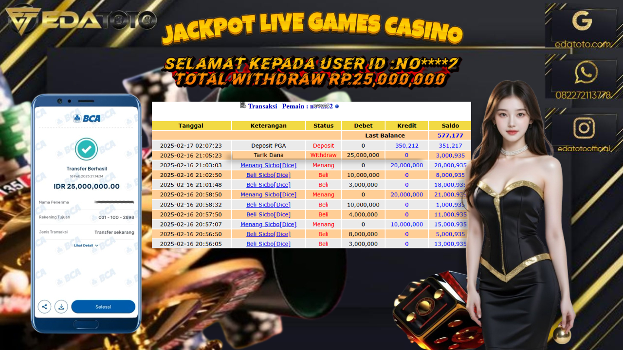 Selamat Kepada Pemilik user ID : se****83 Hari/Tanggal : Senin / 25 , FEBRUARY 2025 Jackpot : Rp. 25.000.000 JT . . .