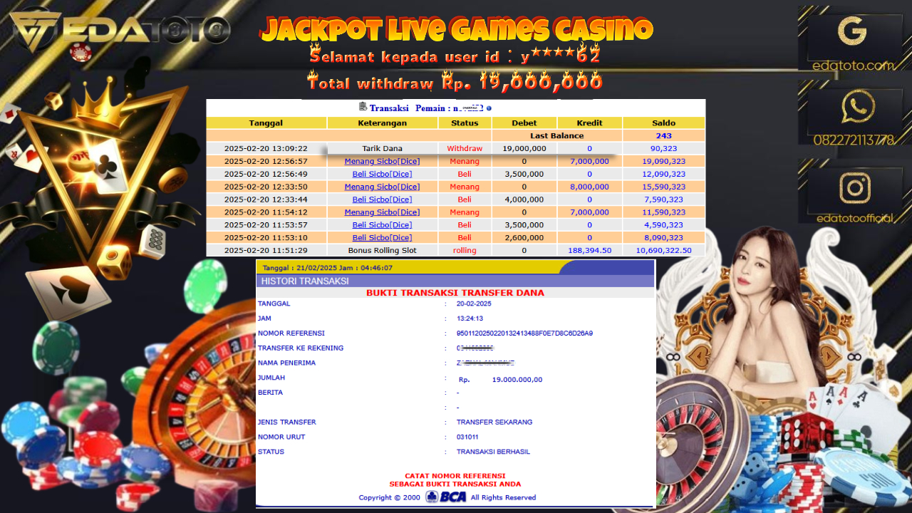 Selamat Kepada Pemilik user ID : y****62 Hari/Tanggal : Senin / 20 , FEBRUARY 2025 Jackpot : Rp. 19.000.000 JT . . .