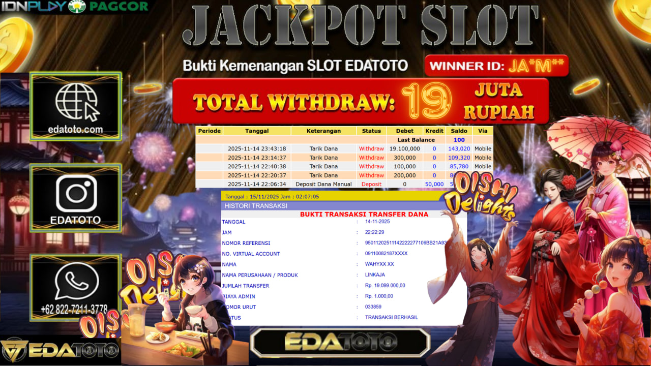 Selamat Kepada Pemilik user ID :Age**1 Hari/Tanggal : Senin / 10, November 2025 Jackpot : Rp. 17,000,000 JT Withdraw :18,500,000 . . .